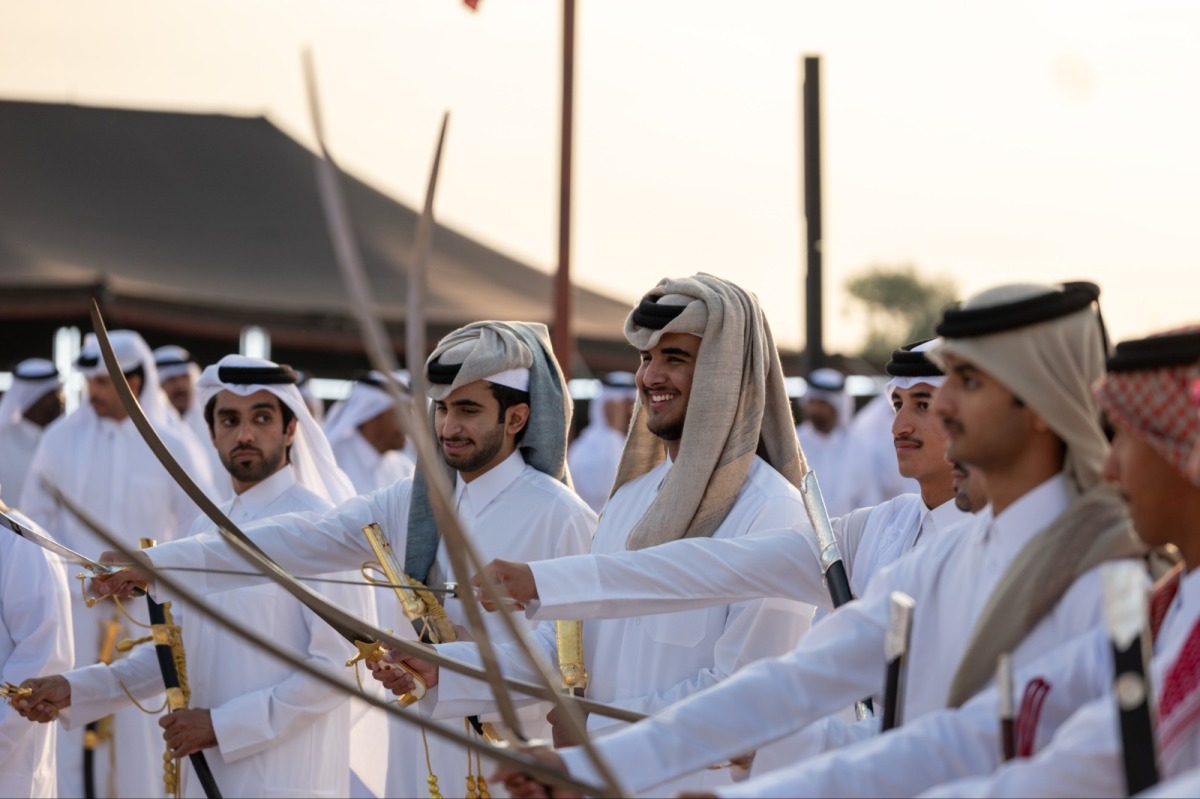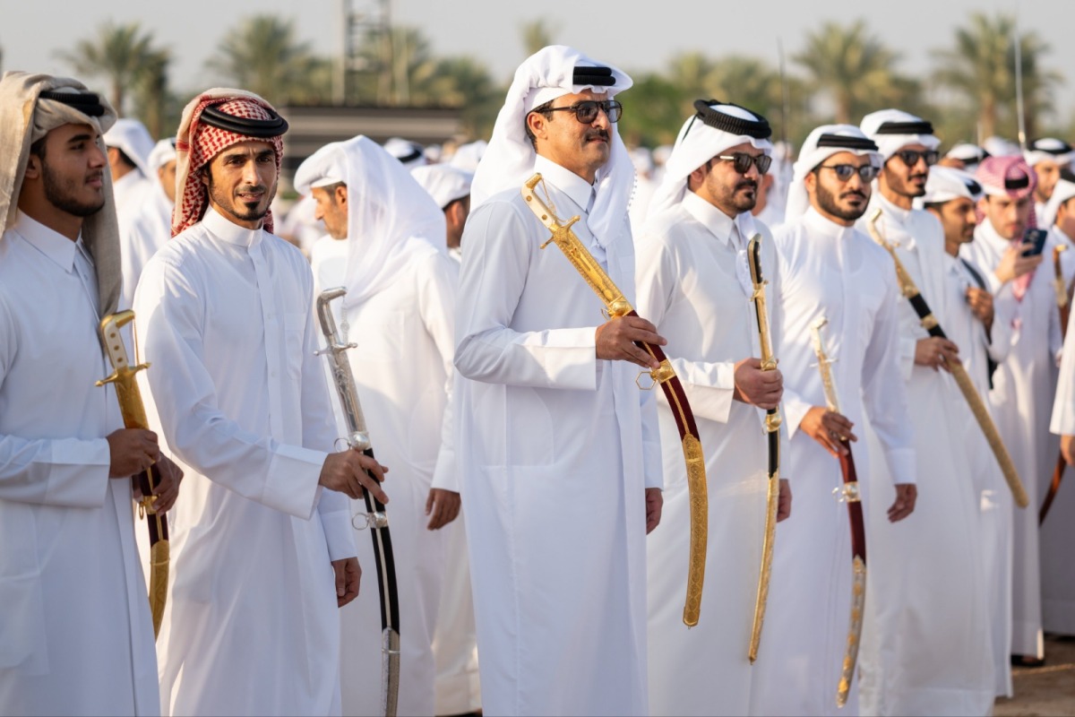 Doha The Amir HH Sheikh Tamim bin Hamad Al-Thani participated in Qatar's Arda (traditional sword dance), which was held in the courtyard of Lusail Palace on Wednesday afternoon to celebrate Qatar National Day.