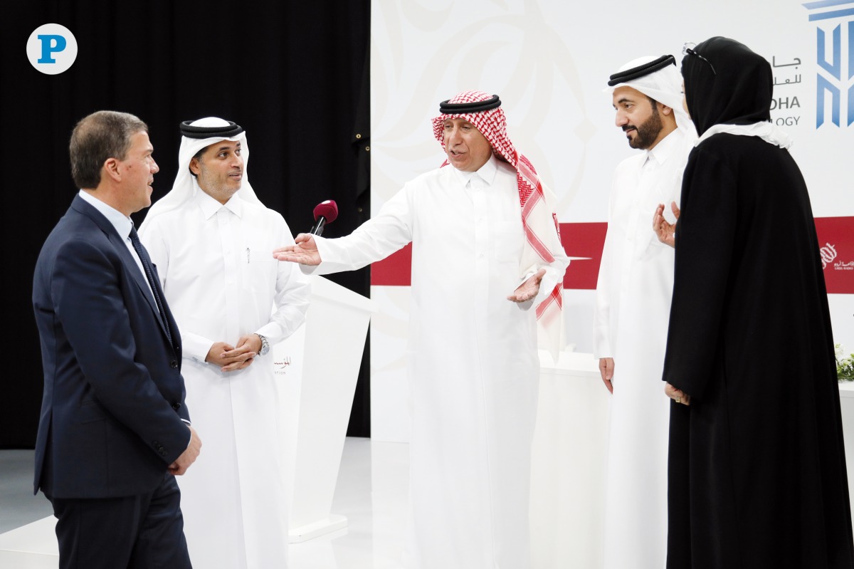 CEO of QMC H E Sheikh Abdulaziz bin Thani bin Khaled Al Thani (2nd right), President of UDST Dr. Salem Al Naemi (3rd right), Consultant at QMC Dr. Ilham Badr Al-Sada (1st right), Consultant at QMC and Editor-in-Chief of The Peninsula Dr. Khalid Mubarak Al-Shafi (2nd left) and Vice President of academics at UDST Dr. Rachid Benlamri (1st left) discussing cooperation on the sidelines of the ceremony.