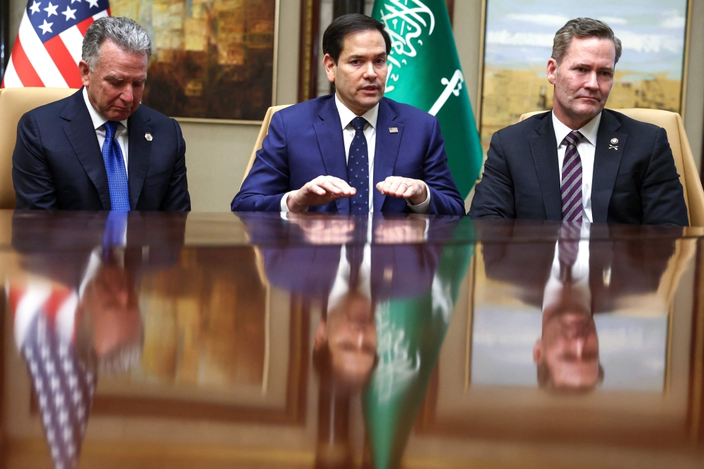 US Secretary of State Marco Rubio (centre), US National Security Advisor Mike Waltz (R) and US Middle East envoy Steve Witkoff attend an interview after meeting with Russian Foreign Minister Sergei Lavrov and Russian President Vladimir Putin's foreign policy advisor Yuri Ushakov, at Diriyah Palace, in Riyadh, Saudi Arabia, on February 18, 2025. (Photo by Evelyn Hockstein / POOL / AFP)