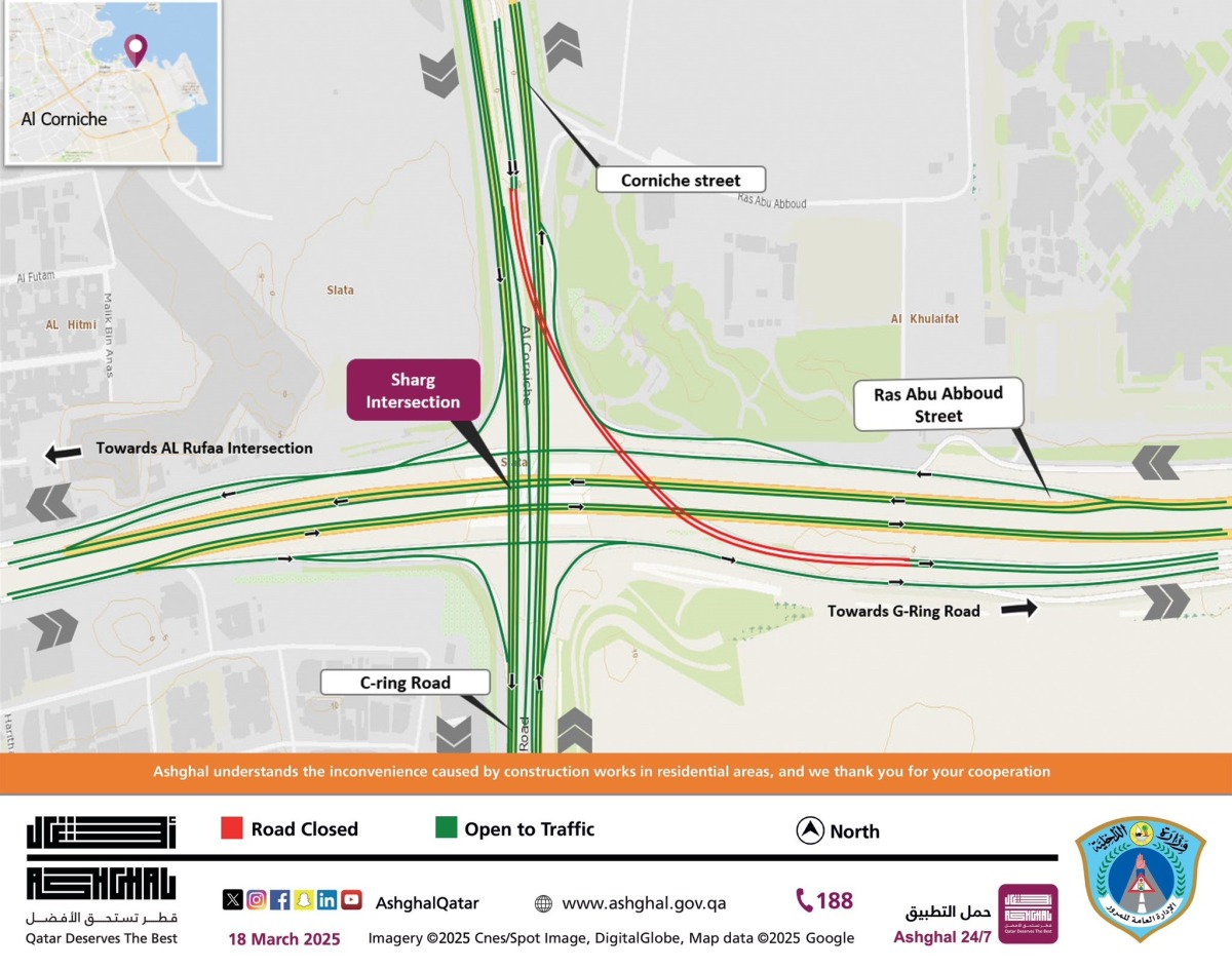 A temporary partial road closure will be implemented at the Sharg Intersection underpass for traffic coming from Al Corniche (Street 210).