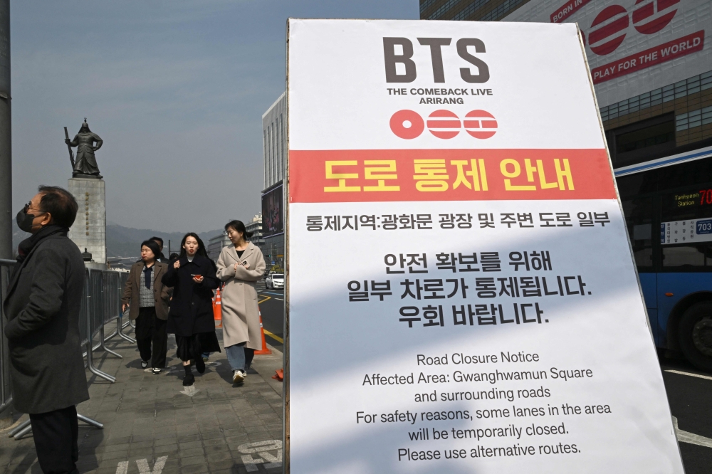 A woman uses her smartphone in front of a billboard promoting a comeback concert of K-pop boy group BTS at Gwanghwamun Square in Seoul on March 17, 2026. (Photo by Jung Yeon-je / AFP)