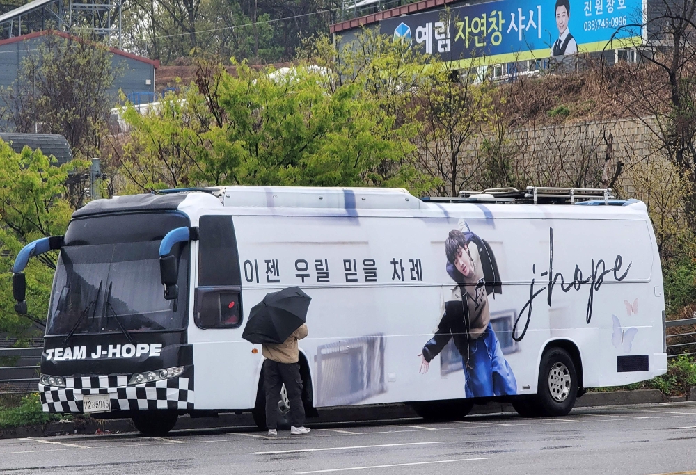 Dozens of fans showed up near the base after arriving via rented buses wrapped with large photos of J-Hope and words hoping for his safe service.