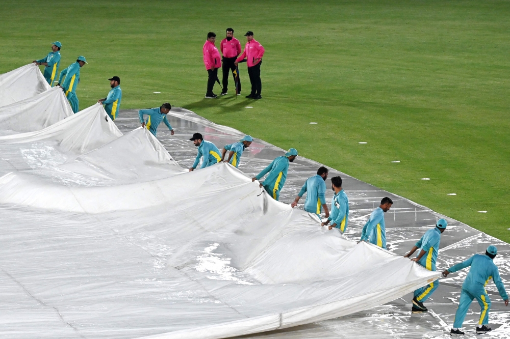 Spectators sit under a plastic sheet in stands during rainfall before the start of the first Twenty20 international cricket match between Pakistan and New Zealand at the Rawalpindi Cricket Stadium in Rawalpindi on April 18, 2024. (Photo by Aamir Qureshi / AFP)