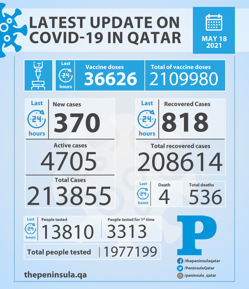 Doha: Ministry of Public Health (MoPH) today reported 370 new cases of coronavirus (Covid-19) and 818 people recovered from the virus in the last 24 hours, bringing the total number of people recovered in Qatar to 208,614.