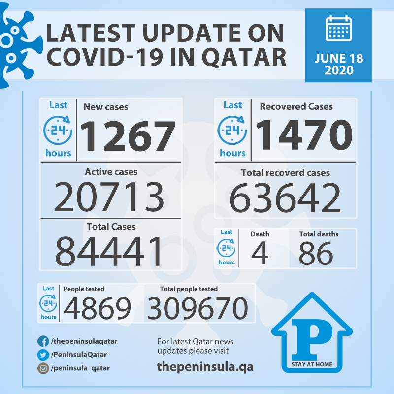 Ministry of Public Health today announced 1267 confirmed new cases of coronavirus (COVID-19) and 1470 recoveries in the last 24 hours, bringing the total number of recoveries in Qatar to 63,642. The Ministry also announced four deaths.