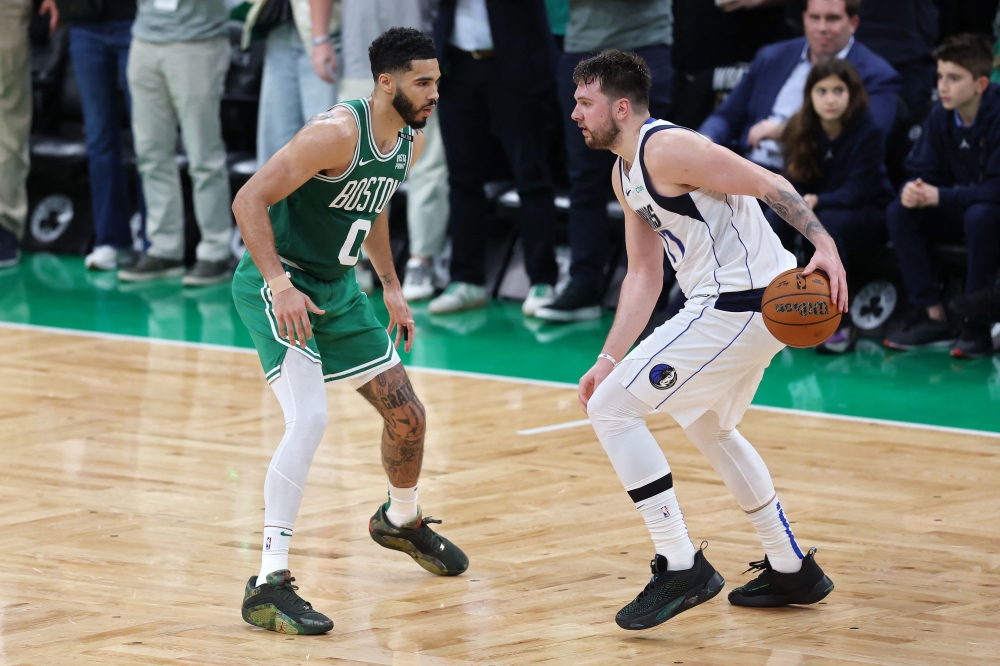 Luka Doncic #77 of the Dallas Mavericks dribbles while Jayson Tatum #0 of the Boston Celtics defends during the second quarter of Game Five of the 2024 NBA Finals at TD Garden on June 17, 2024 in Boston, Massachusetts. (Photo by Adam Glanzman / GETTY IMAGES NORTH AMERICA / Getty Images via AFP)