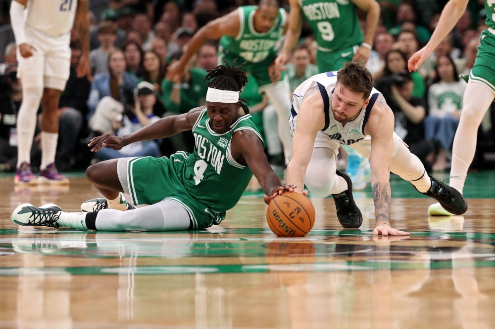 Jrue Holiday #4 of the Boston Celtics and Luka Doncic #77 of the Dallas Mavericks dive for a loose ball during the second quarter of Game Five of the 2024 NBA Finals at TD Garden on June 17, 2024 in Boston, Massachusetts. (Photo by ELSA / GETTY IMAGES NORTH AMERICA / Getty Images via AFP)