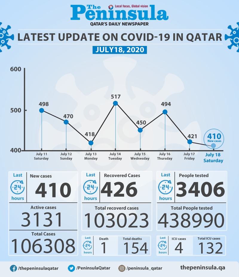 Qatar reports one death, 410 Covid-19 cases and 426 recoveries on July 18