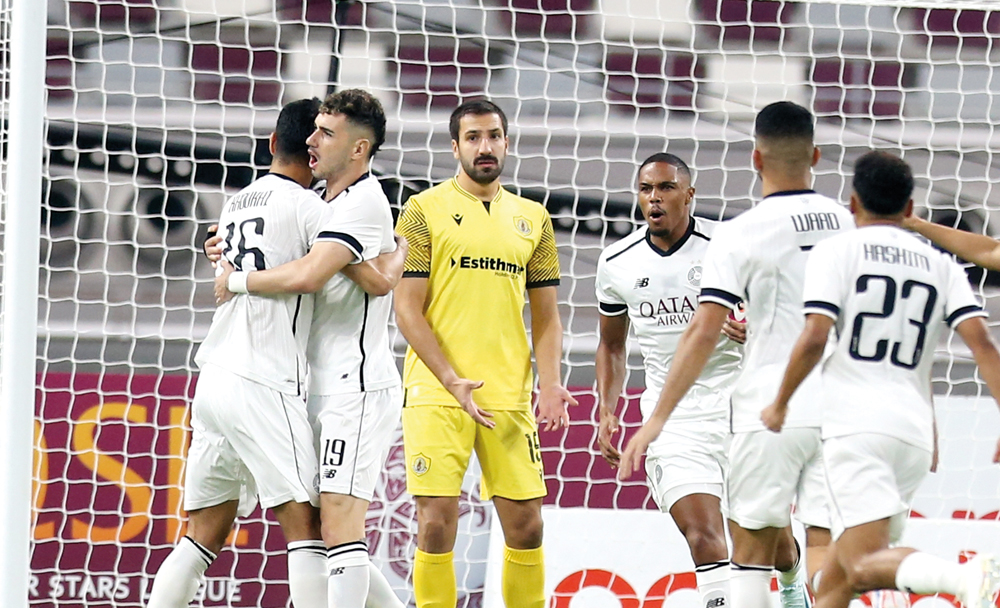 Al Sadd's Rafa Mujica (second left) celebrates with teammate Boualem Khoukhi after scoring a goal against Qatar SC.