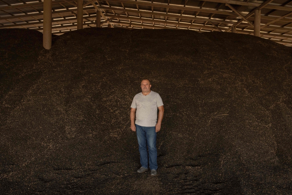 Oleksandr Ryabinin, the 52-year-old farm director, poses for a portrait next to a pile of sunflower seeds at a collecting station, outside Kryvyi Rig. (Photo by Roman Pilipey / AFP)