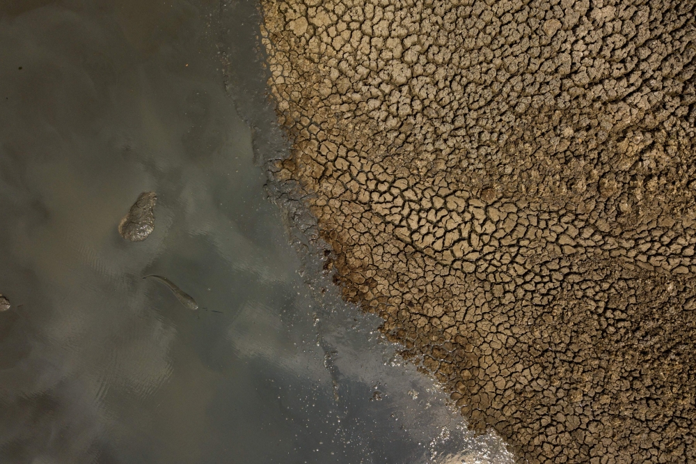 An aerial photograph shows fish flipping in the mud at a drying watering hole in the Hwange National Park, in Zimbabwe, on November 12, 2019. (Photo by Zinyange Auntony / AFP)