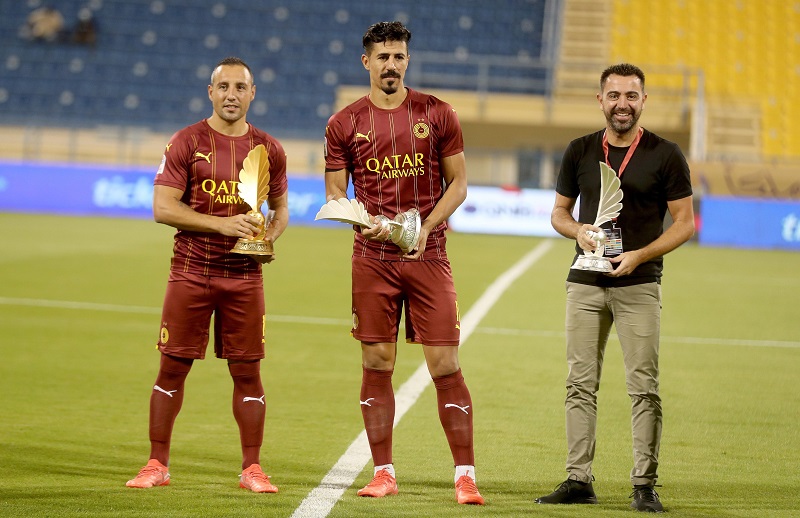 The 2020-21 QFA's 'Best Player of the Year' Santi Cazorla, winner of the Mansour Muftah Award 'Top Scorer of the Season' - Baghdad Bounedjah, and 'Best Coach of the Season' - Xavi Hernandez with their awards ahead of yesterday's QNB Stars League match against Al Gharafa.