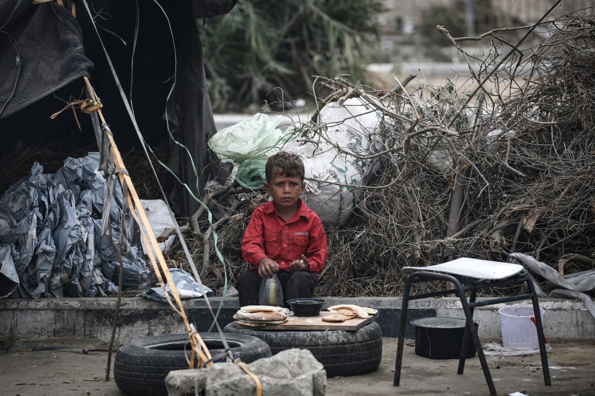 A Palestinian child eats at a make-shift camp for the internally displaced in Deir al-Balah in the central Gaza Strip on October 17, 2024. Photo by Eyad BABA / AFP.
