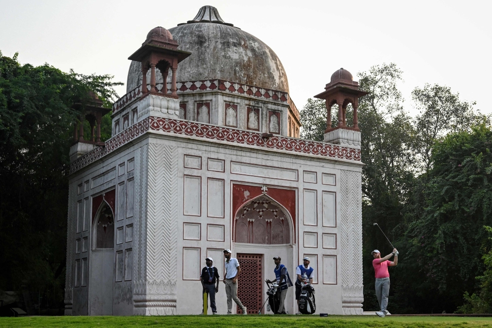 A participant plays a shot beside a Mughal-era heritage monument during the DP World India Championship 2025 golf tournament. (Photo by Arun Sankar / AFP)