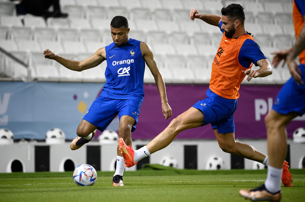 Kylian Mbappe (left) and Olivier Giroud during a training session yesterday. AFP