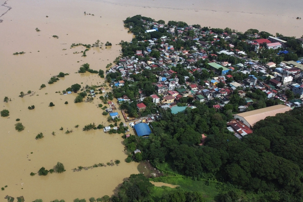 An aerial view shows submerged homes at a village in Ilagan, Isabela province on November 18, 2024, due to continuous heavy rains from Super Typhoon Man-yi. (Photo by Villamor Visaya / AFP