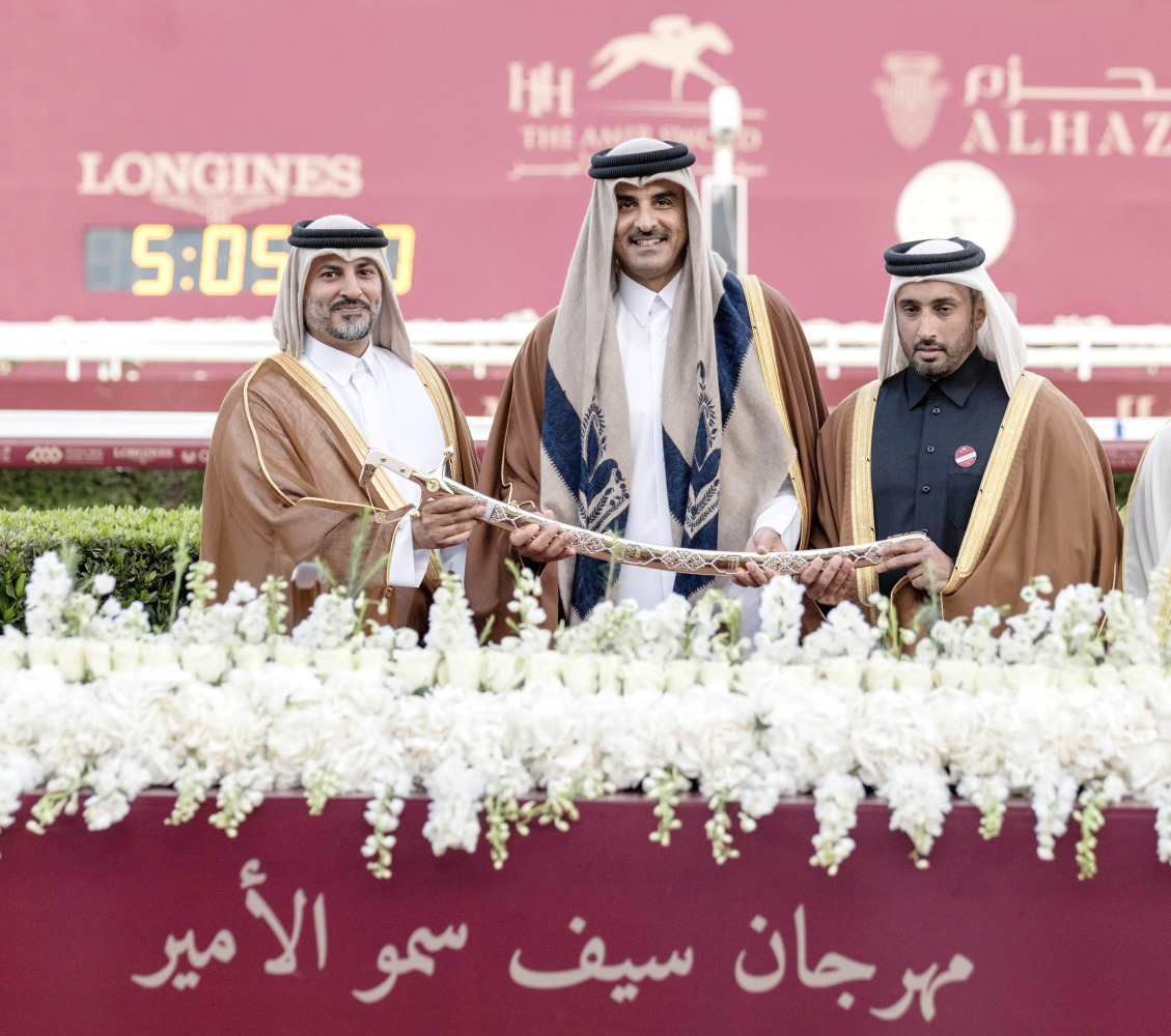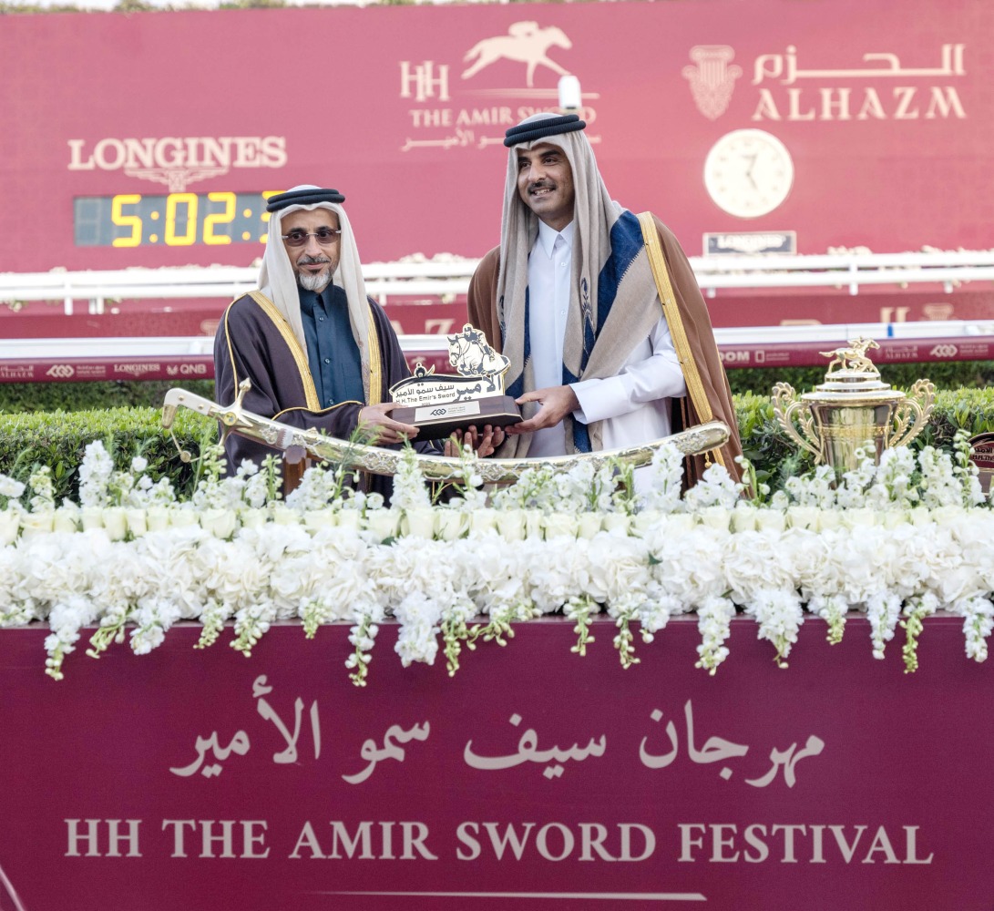 He handed the Silver Sword to Abdulrahman bin Hamad Al Attiyah as “Ska De L’Aigle” won the 6th race of Purebred Arabian (4yo only) 1850m, and handed the Shalfa (spear) to Khalid Shuail Al Kuwari for “King Pacha” victory in the 5th race of Thoroughbred Open Handicap (Class 2) 2000m.