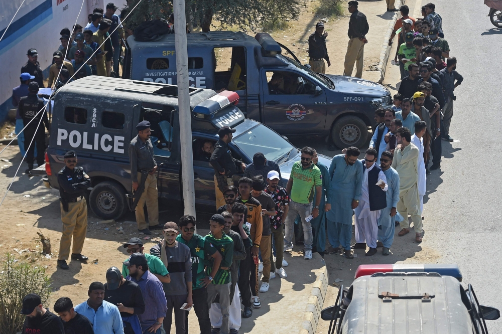 Spectators display their match tickets while waiting to enter the National Stadium in Karachi on February 19, 2025. (Photo by Rizwan Tabassum / AFP)