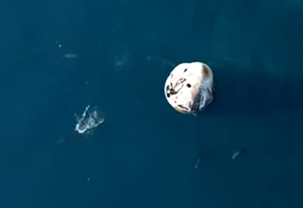 This still image from a NASA+ livestream shows dolphins swimming around the Dragon capsule with the SpaceX Crew-9 astronauts aboard after splashdown on March 18, 2025, off the coast of Talahassee, Florida. (Photo by Handout / NASA+ / AFP)