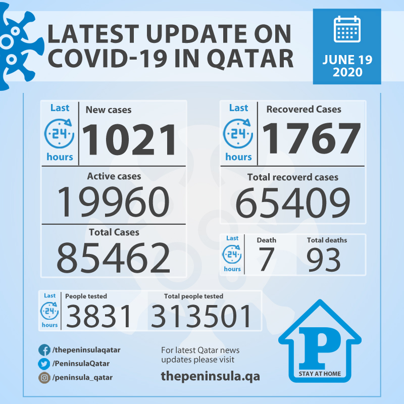 Ministry of Public Health today announces 1021 new cases of coronavirus (COVID-19), with 1,767 people having recovered from the disease in the last 24 hours, bringing the total number of recoveries in the State of Qatar to 65,409. The Ministry also announces seven deaths