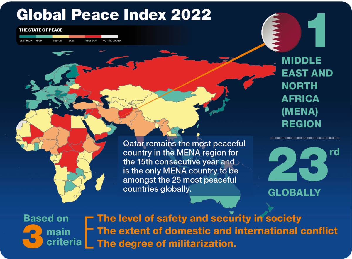 Doha: Qatar topped the countries of the Middle East and North Africa (MENA) region for the fourth year in a row, according to the Global Peace Index Report for 2022. Qatar ranked 23 globally among 163 countries included in the report, advancing by six places over the previous year and it secured an overall score of (1.530) above many of the developed countries.