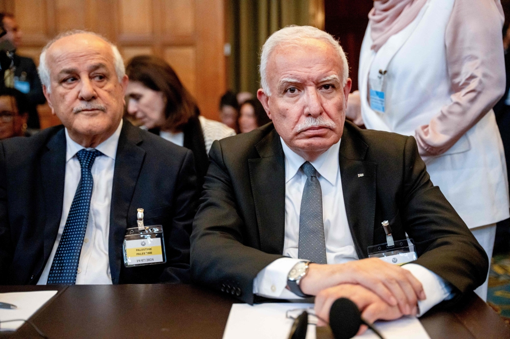 Foreign Minister of Palestine, Riyad al-Maliki (R) and Palestinian Ambassador to the United Nations, Riyad Mansour (L) during a non-binding ruling on the legal consequences of the Israeli occupation of the West Bank and East Jerusalem at the International Court of Justice (ICJ) in The Hague on July 19, 2024. (Photo by Lina Selg / ANP / AFP) / Netherlands OUT