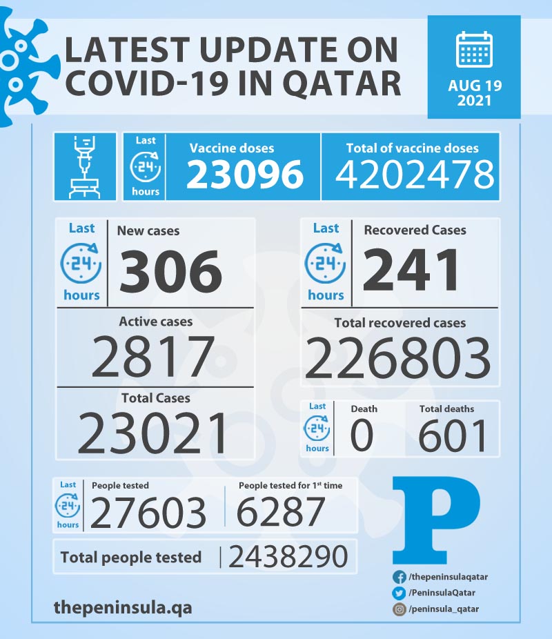 Doha: Ministry of Public Health (MoPH) today reported 306 new cases of coronavirus (Covid-19) and 241 people recovered from the virus in the last 24 hours, bringing the total number of people recovered in Qatar to 226,803.