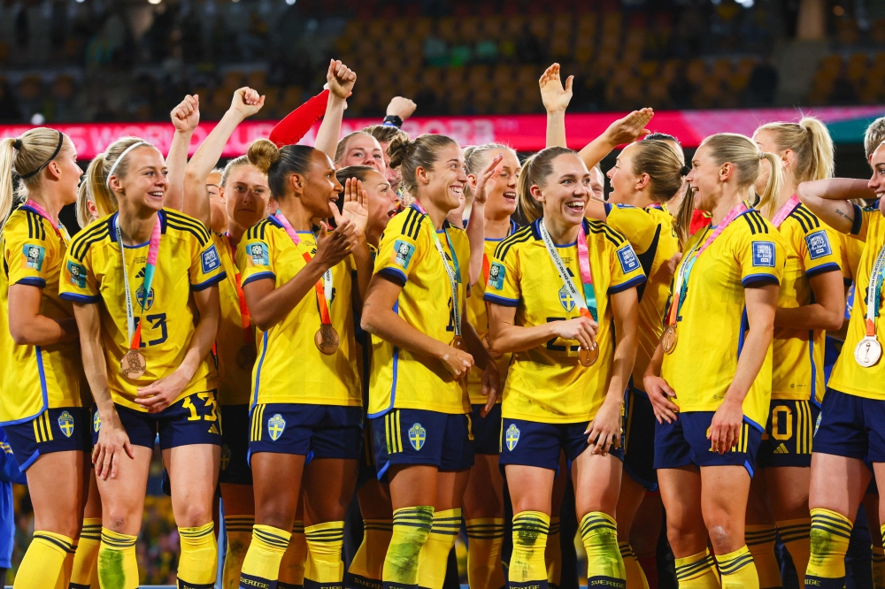 Sweden players celebrate with their bronze medals after winning the Australia and New Zealand 2023 Women's World Cup third place play-off football match between Sweden and Australia at Brisbane Stadium in Brisbane on August 19, 2023.