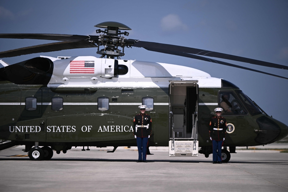 US Marines stand next to Marine One, the new VH-92A model, before US President Joe Biden and First Lady Jill Biden board after exiting Air Force One upon arrival at Chicago O'Hare International Airport in Chicago, Illinois, on August 19, 2024. (Photo by Brendan Smialowski / AFP)