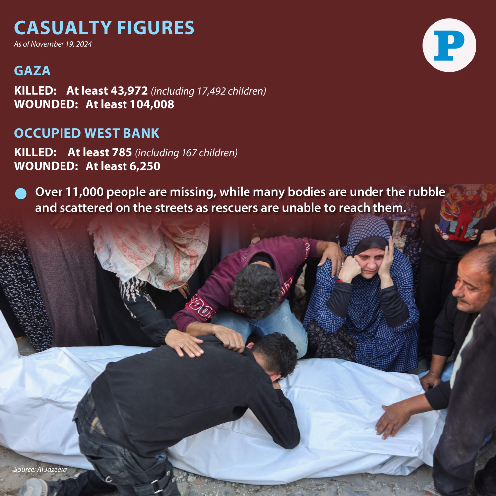 Gaza: The Israeli occupation forces (IOF) murdered at least 43,972 Palestinian civilians and injured at least 104,008 others since the beginning of the genocide that the Israeli occupation has been committing against the Gaza Strip in October 2023, most of whom are children and women.
