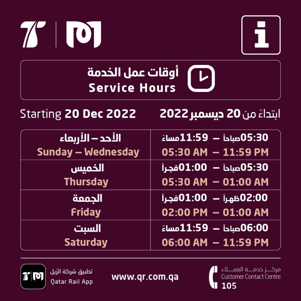 DOHA: Doha Metro & Lusail Tram has announced today, December 19, 2022, on its social media handles the new service hours starting tomorrow, December 20.