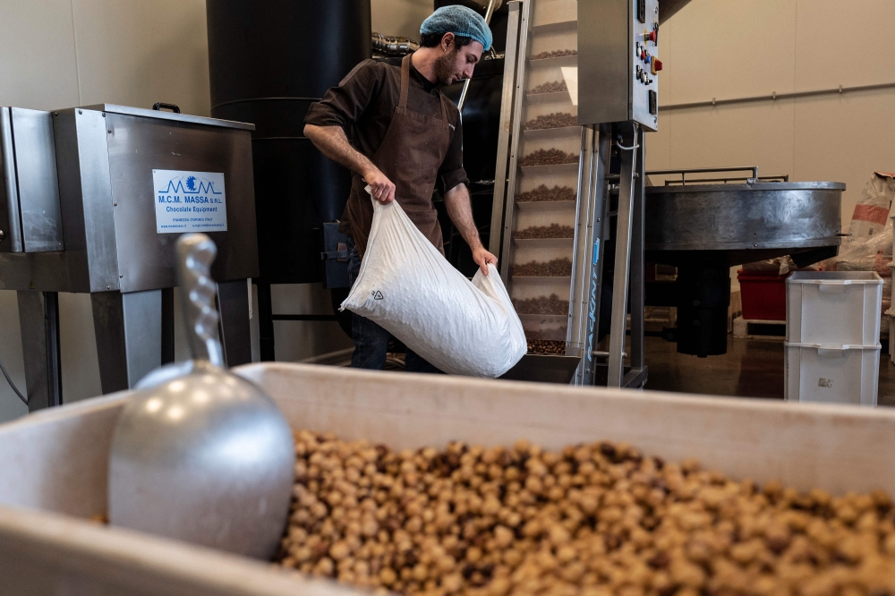 Guido Castagna, president of the Gianduiotto Committee in Turin, pours bag after bag of hazelnuts into a machine which roasts them before they are ground up and mixed with cocoa.