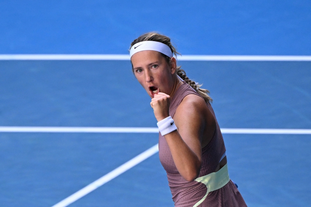 Belarus' Victoria Azarenka celebrates after victory against Latvia's Jelena Ostapenko in Melbourne on January 20, 2024. (Photo by William West / AFP)