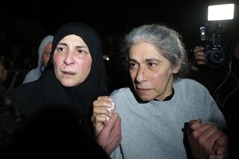 A Palestinian woman cries as she embraces a loved one who was released from Israeli jail in the early hours of January 20, 2025. (Photo by Zain Jaafar / AFP)