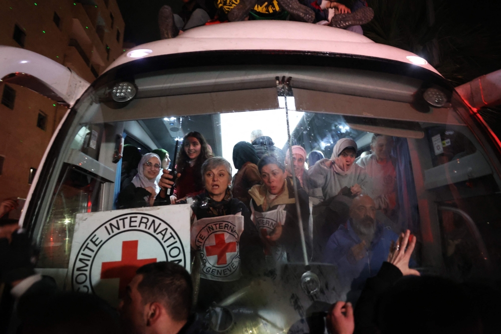 Pictures from the occupied town of West Bank Beitunia, on the outskirts of Ramallah where people gather around the Red Cross bus carrying some 90 prisoners set free by Israel in the early hours of January 20, 2025, upon its arrival. Crowds cheered, chanted and honked car horns as two buses carrying the prisoners arrived in Beitunia following their release as part of the Gaza ceasefire deal that began on January 19 and saw three Israeli hostages freed by Hamas in the Gaza Strip. Photos by Zain Jaafar / AFP