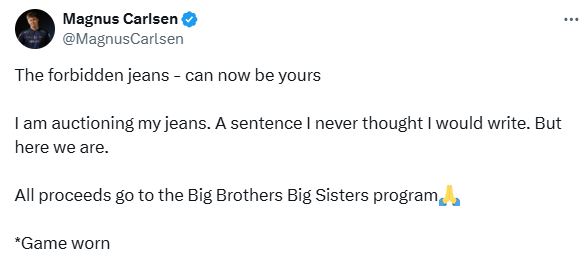 "The forbidden jeans can now be yours," Carlsen wrote in a post to X, noting they were "game worn".