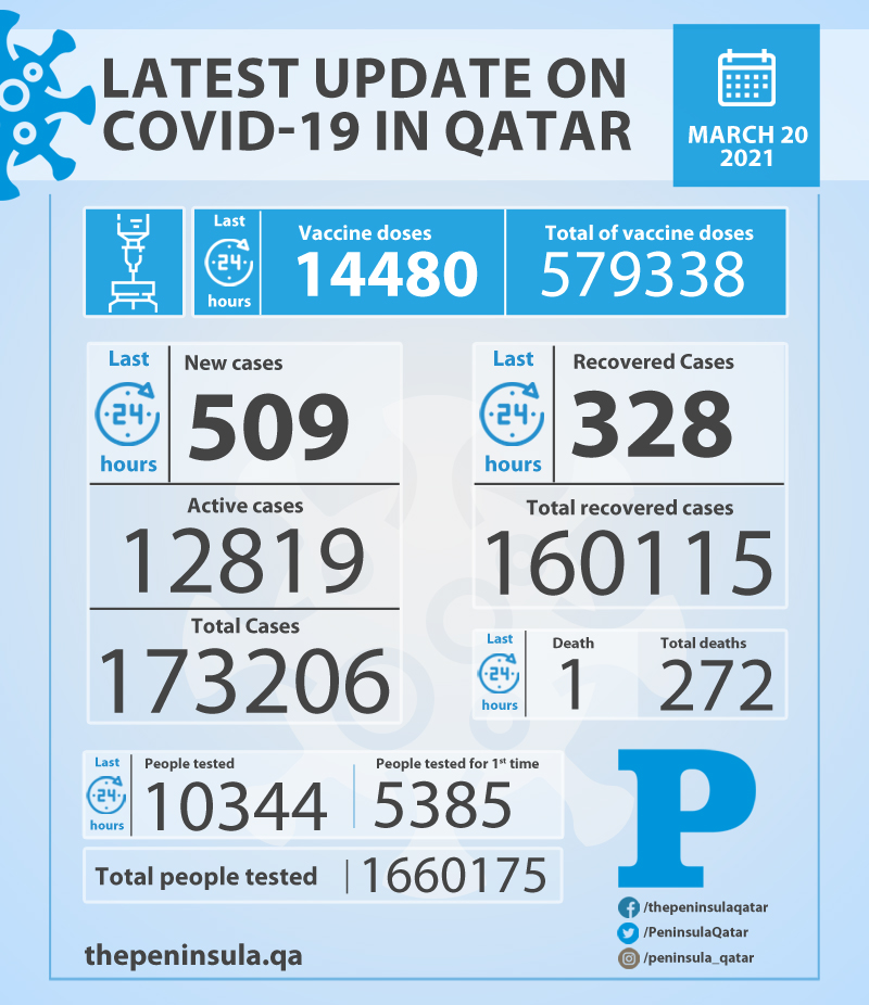 Doha: Ministry of Public Health (MoPH) today reported 509 new cases of coronavirus (Covid-19) and 328 people recovered from the virus in the last 24 hours, bringing the total number of people recovered in Qatar to 160,115.