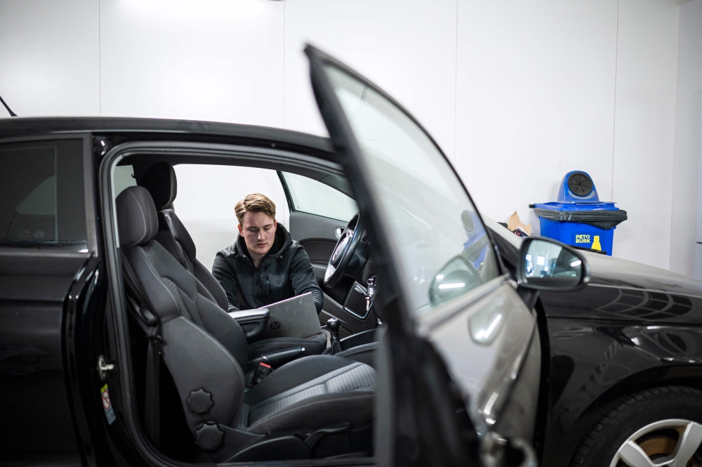 22-year-old Oskar Flyman works on a car in his garage, specializing in converting regular cars into A Traktors, on February 28, 2023, in Balsta, northwest of Stockholm, Sweden. Photo by Jonathan NACKSTRAND / AFP