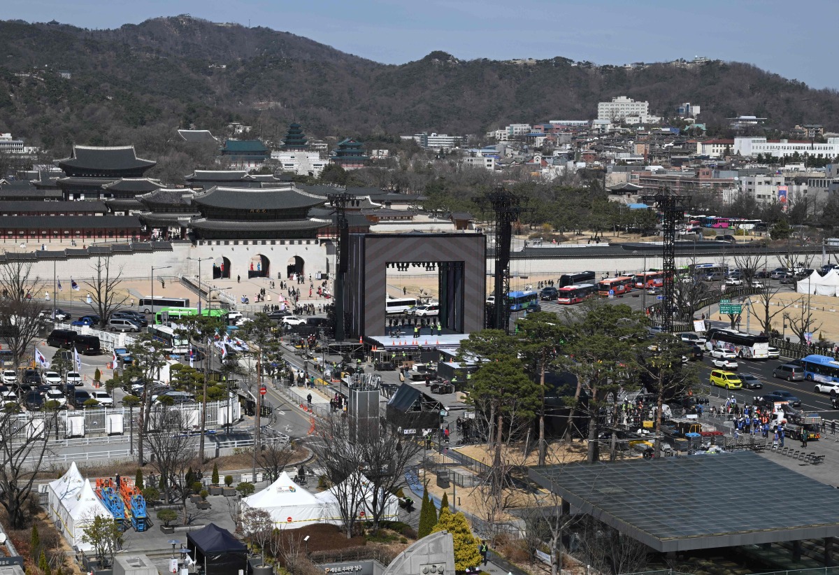 Workers set up the stage (C) for the comeback concert of K-pop boy group BTS in front of Gwanghwamun Gate (L), the main gate of Gyeongbokgung Palace, in Seoul on March 19, 2026. Photo by Jung Yeon-je / AFP