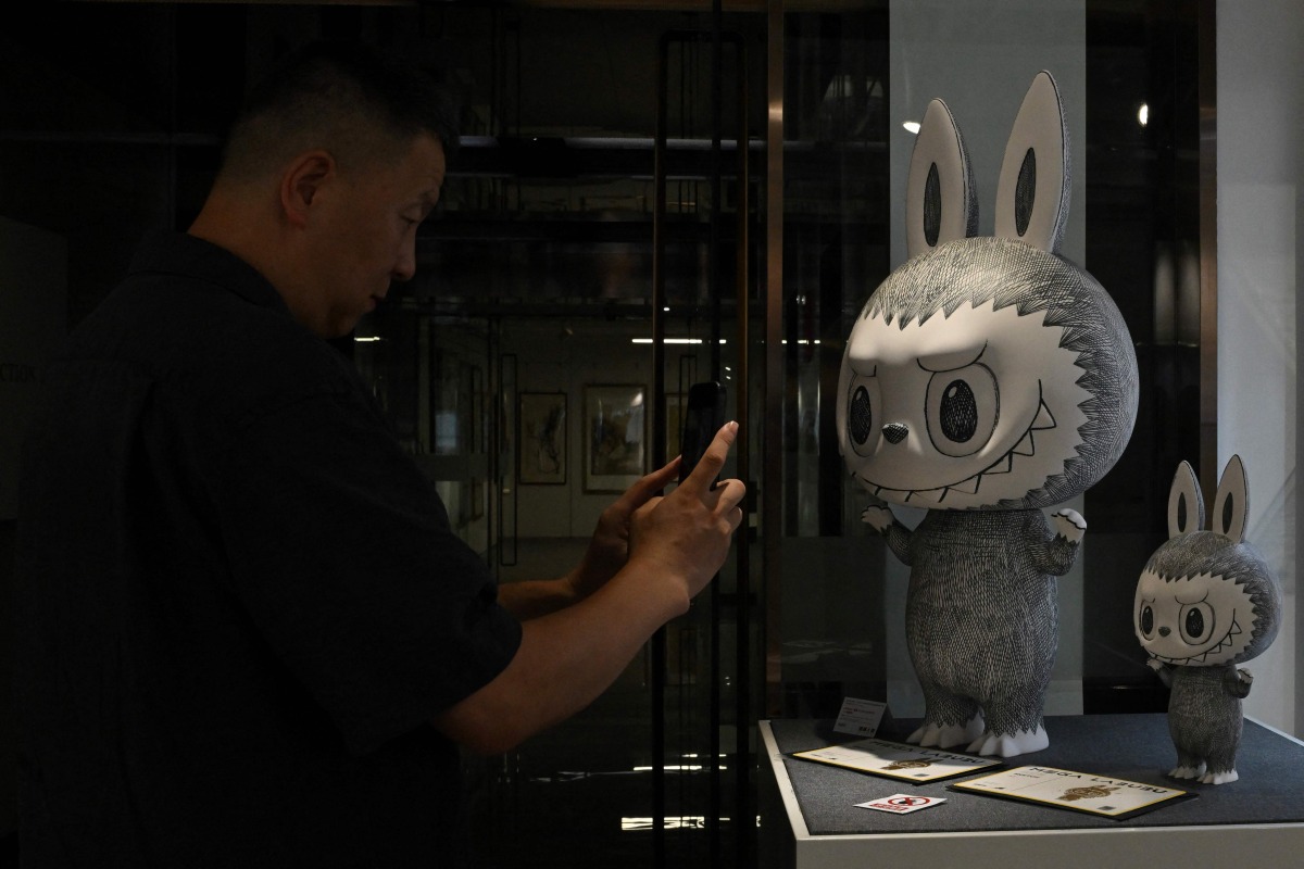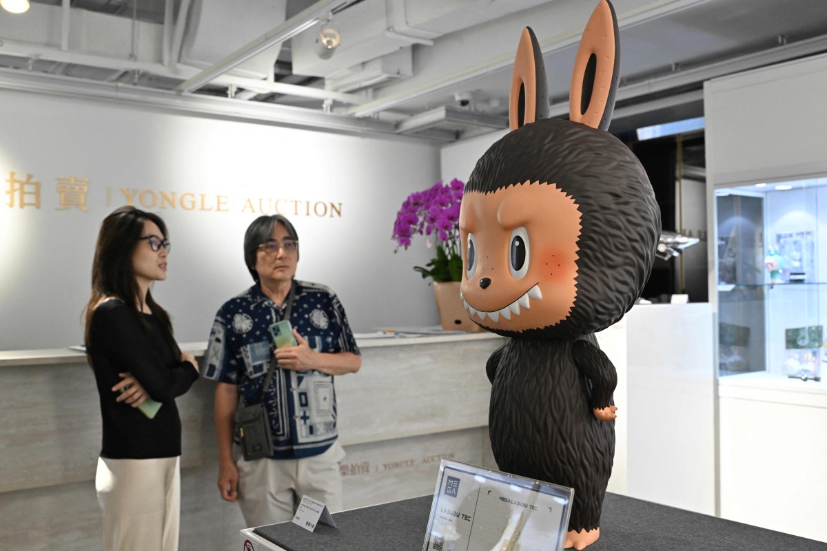 People visit the Yongle Auction office where limited-edition Labubu artworks are on display in Beijing on June 20, 2025 ahead of an auction on June 22. (Photo by Adek BERRY / AFP)