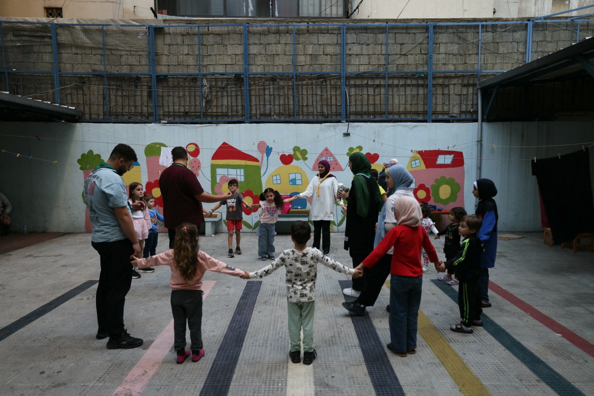 Volunteers entertain children who fled Israeli bombardment in southern Lebanon, at a shelter in Beirut where they took refuge with their families, on October 20, 2024. Photo by IBRAHIM AMRO / AFP.