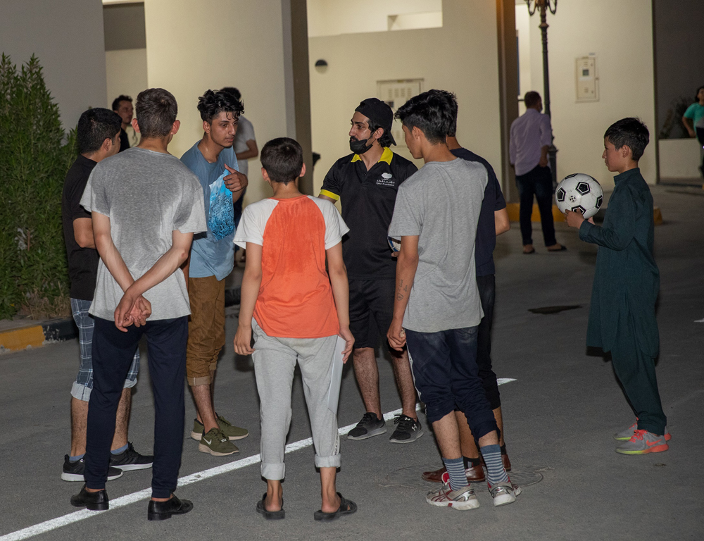 A QF volunteer talking to a group of boys at the Afghan Refugee compound.