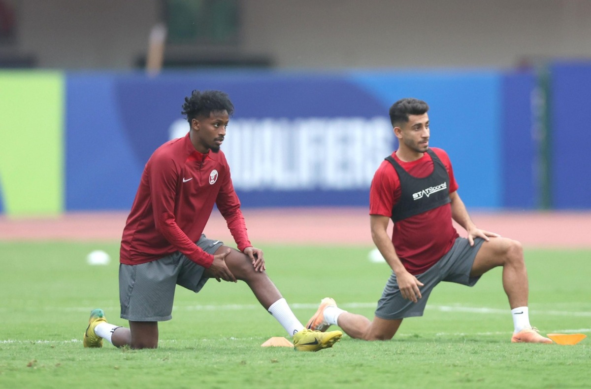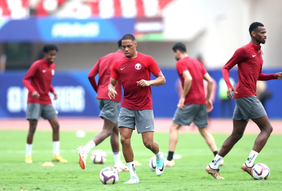 Qatar striker Almoez Ali (foreground) along with teammates takes part in team's training session in Bhubaneswar on Tuesday.