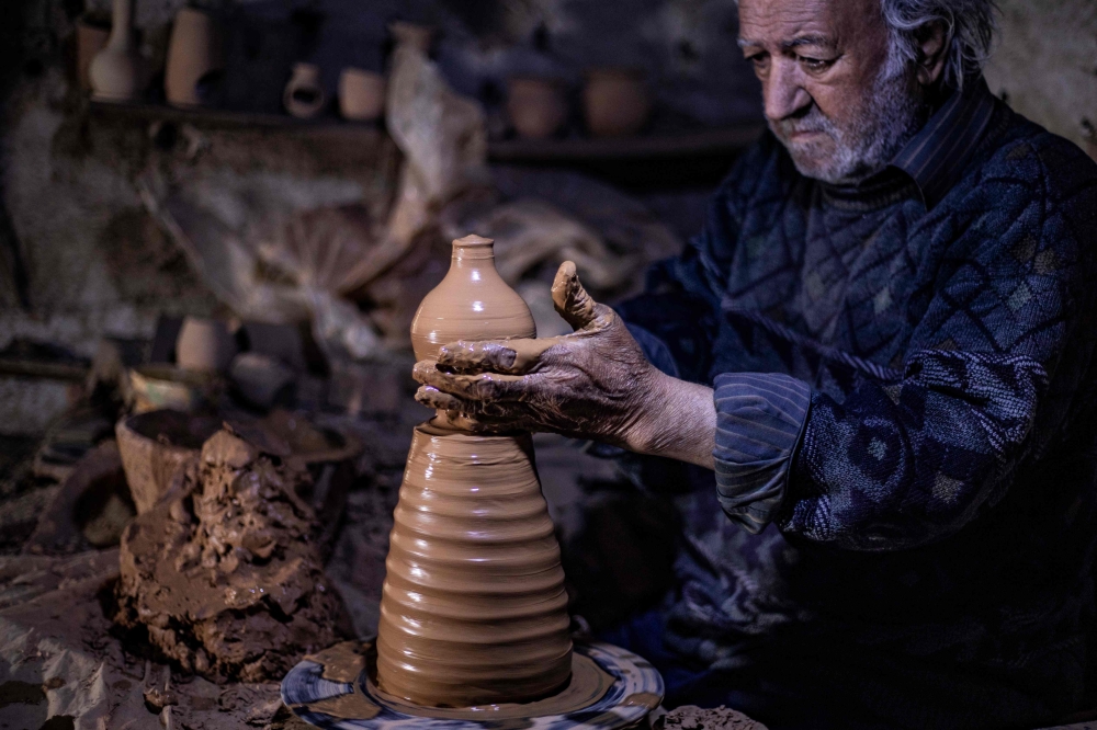 Qamishli, Syria: Inside a dusty and dark workshop on the banks of the Jaghjagh river in northeast Syria, Misak Antranik Petros uses an ancient pottery wheel to throw different shapes from clay.
