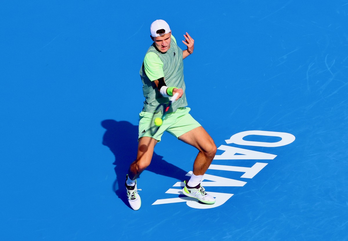 Jakub Mensik hits a shot against Alejandro Davidovich Fokina.