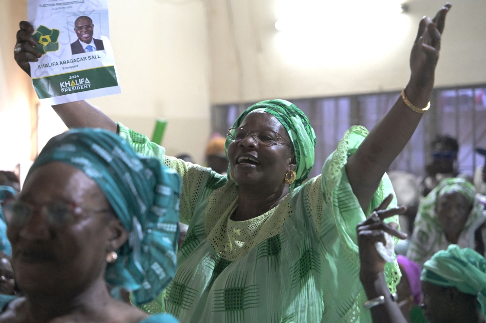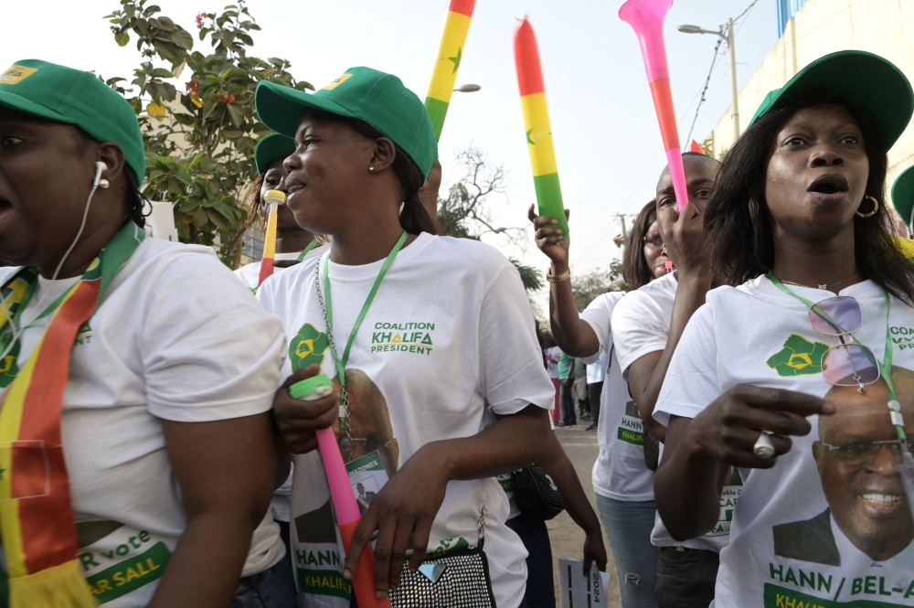 Supporters of Senegalese presidential candidate Khalifa Sall take part in a campaign meeting in Hann Bel-Air, Dakar, on February 19, 2024. (Photo by Seyllou / AFP)