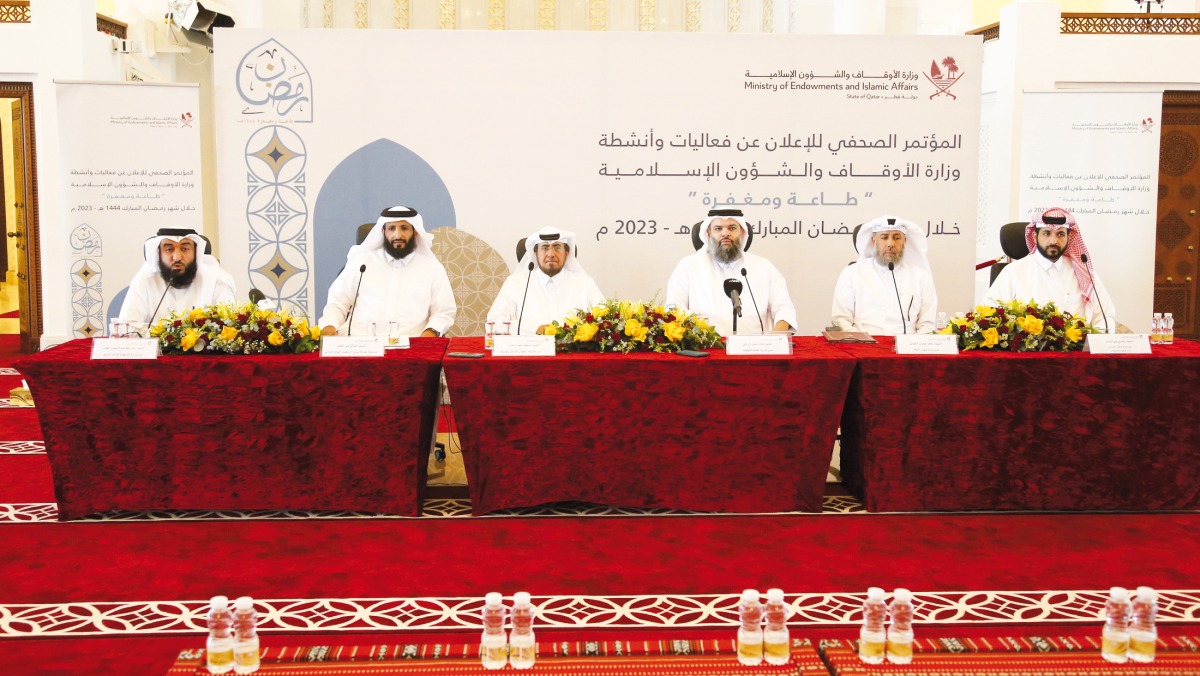Assistant Undersecretary for Religious Calls and Mosques at the Ministry of Awqaf and Islamic Affairs Mohamad Hamad Al Kuwari and Director of Endowments Department, Sheikh Dr. Khalid bin Mohamad Al Thani with other officials during a press conference at Imam Muhammad Ibn Abd Al Wahhab Mosque, yesterday.