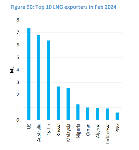 Qatar is among the top 10 LNG exporters in February 2024. The US was the largest LNG exporter in February this year, followed closely by Australia and Qatar, according to the monthly gas market report of March 2024 by Gas Exporting Countries Forum (GECF).