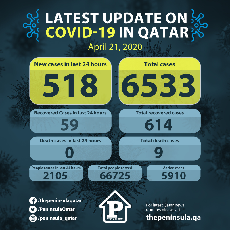 Ministry of Public Health today announced 518 new confirmed cases of COVID-19, and the recovery of 59 cases, bringing the total number of recovered cases in Qatar to 614