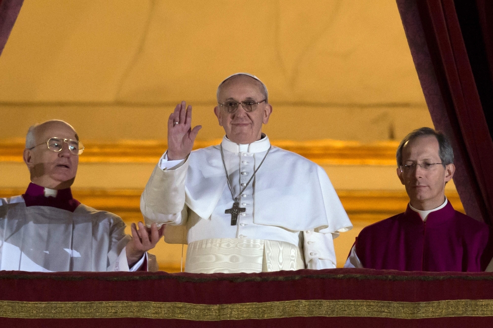 (Files) Argentina's Jorge Bergoglio, elected Pope Francis I (C) appears at the window of St Peter's Basilica's balcony after being elected the 266th pope of the Roman Catholic Church. (Photo by Vincenzo Pinto / AFP)